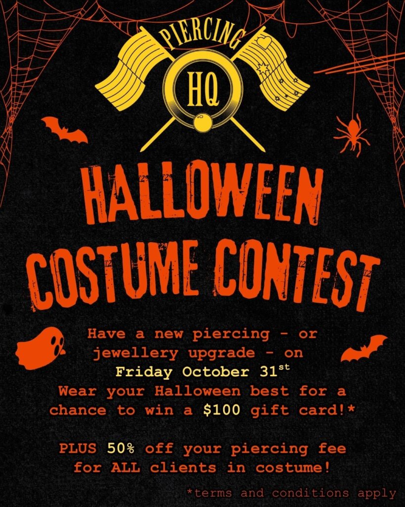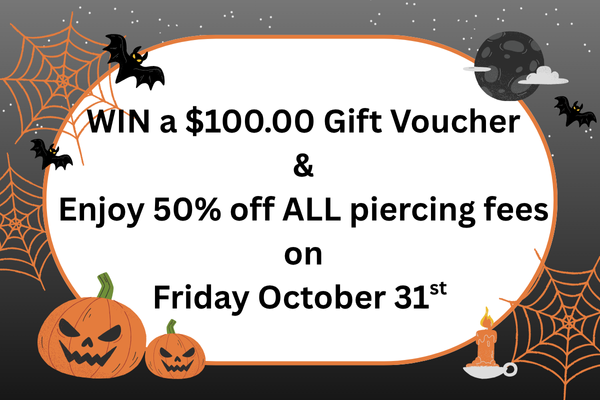 DRESS UP in your Halloween best (or at least make an effort) and we’ll put you in the draw to WIN when you have a new piercing or jewellery upgrade for Halloween. Everyone wins though with 50% off all piercing fees on the day and FREE jewellery changeovers.